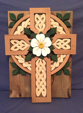And a rose at the centre of the cross? That breaks the rules of Celtic design. There should be a tight little knot in the centre. But here I have a white rose, which is a symbol of holiness. A white rose is associated with the Virgin Mary, and it is associated with saints. A red rose is romantic love; a white rose is spiritual love. And it is not a tame garden rose; it is a wild rose. A wild rose is not contained. The rose on this piece is not in a tight little Celtic circle but pushes beyond boundaries.